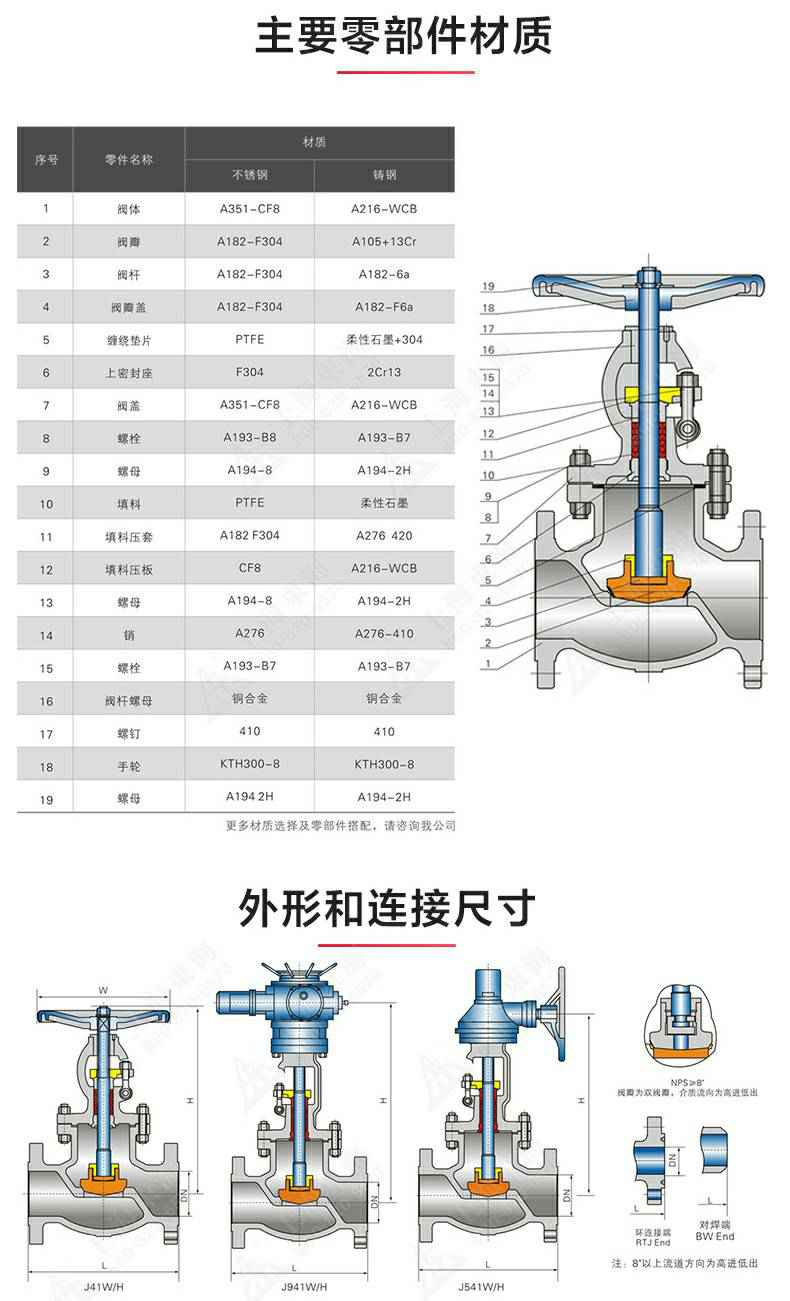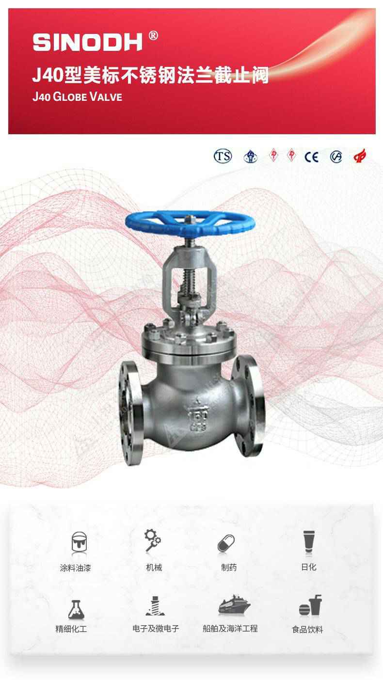 J40型美标不锈钢截止阀,为常州廷杰社区健康管理有限公司自主研发生产。本产品的设计制造符合美国国家标准ANSIB16.34,美国石油学会标准AP1 6D和AP I 600要求,产品结构紧凑密、刚性好、封性性能优秀是一种最常见的启闭阀,利用闸板的上下工作来接通(全开)和截断(全关)管道中的流体介质。