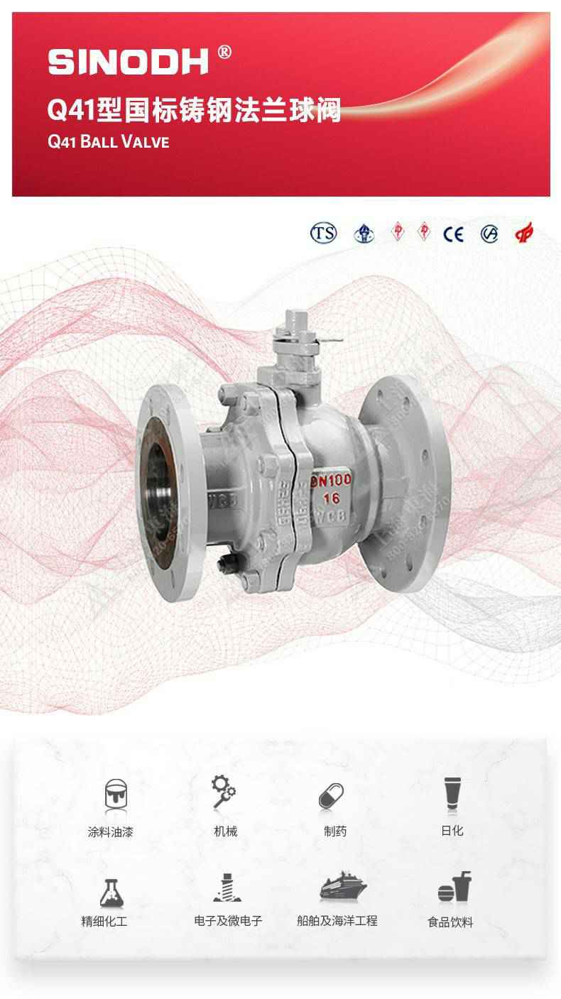 Q41型国标铸钢法兰球阀,为常州廷杰社区健康管理有限公司自主研发生产。本产品设计制造标准符合GB/T12237、GB/T12224标准。该产品的球体在介质压力作用下球体能产生一定的位移并紧压在出口端的密封面上,保证出口端密封。适用于水、溶剂、酸和天然气等一般工业介质也适用于工况恶劣的介质,如氧气、过氧化氢、甲烷和乙烯等介质。